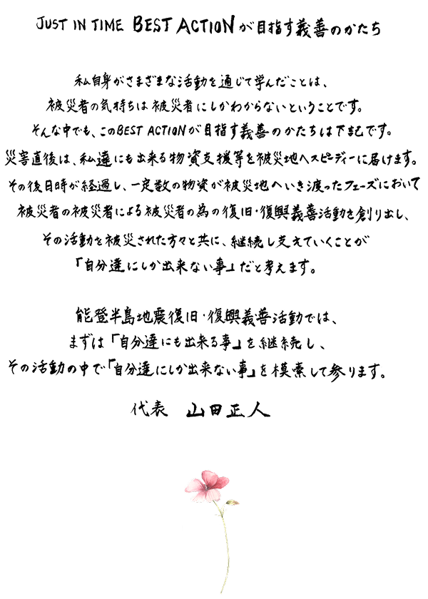 JUST IN TIME BEST ACTIONでは、痒いところに手が届き、スピーディーに支援ニーズの変化に対応して、「今」自分達にも出来る事・自分達にしか出来ない事を、無理せず継続的に活動していくことを理念としております。