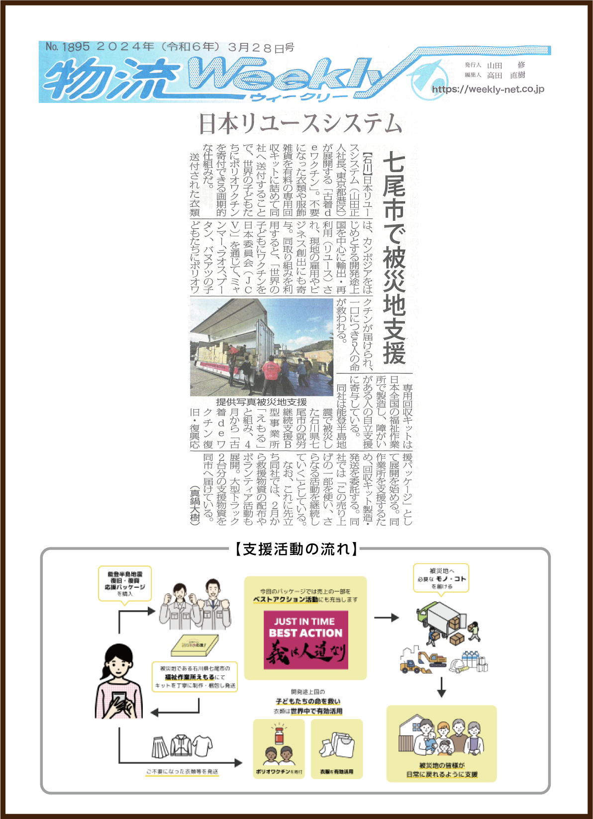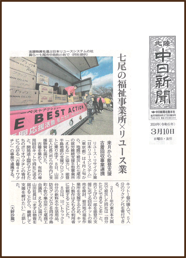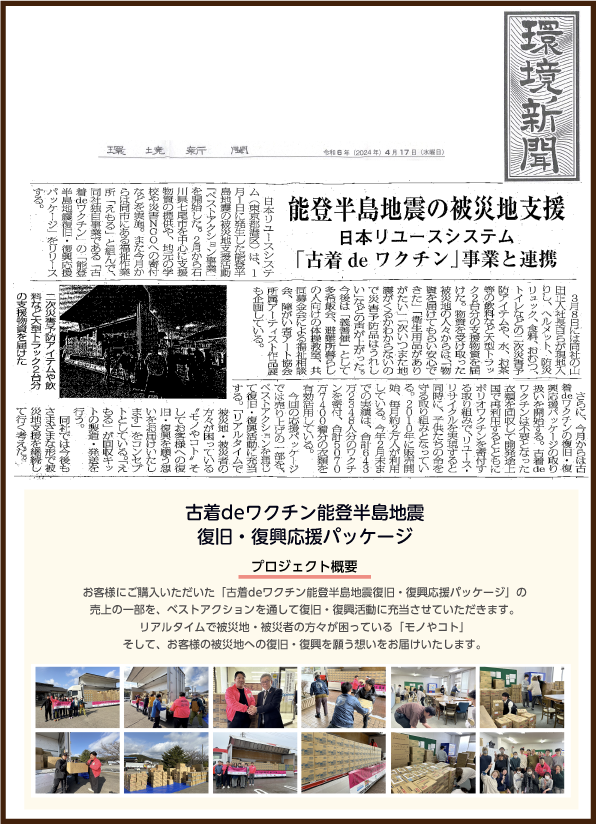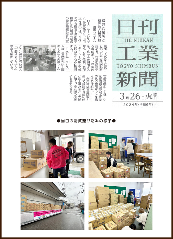 古着deワクチン能登応援パッケージでは、専用回収キットの製作と発送を担当しております。私たちの周りにはまだ開所できていない福祉作業所がたくさんあります、サポートし元気づけることができる存在になりたいともいます。