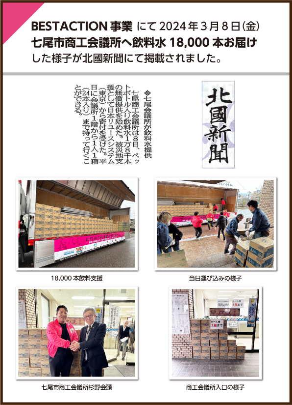 2024年3月9日 【北國新聞】にてBEST ACTION事業「能登半島飲料支援」が掲載されました。