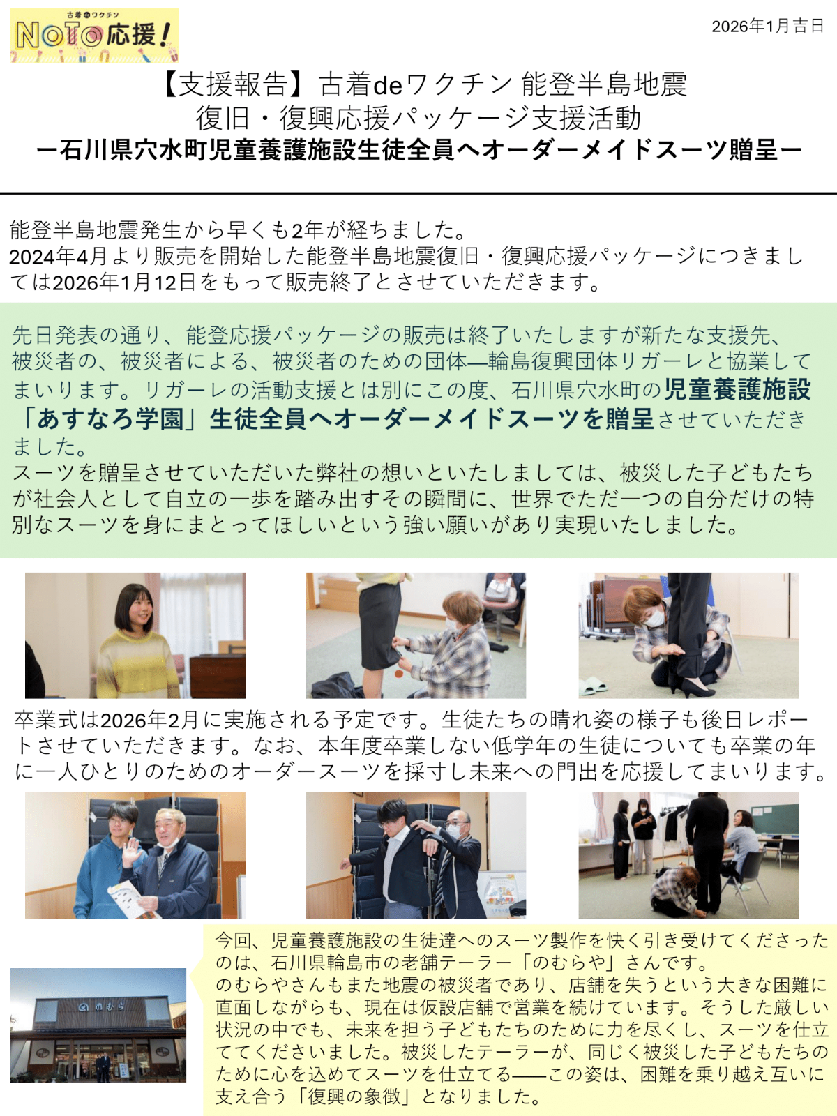 【能登支援】穴水町養護施設全生徒へオーダーメイドスーツ贈呈